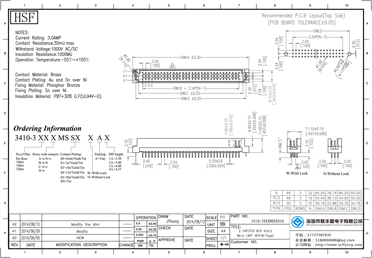 產品分類:DIN 41612連接器 產品型號:聯豐盈 2.54間距 直插型 3*32p 公座 DIN41612 連接器 技術參數:額定電流:3.0amp電流電阻:30m最大耐壓:1000V的交流/直流絕緣電阻:1000分鐘操作溫度: