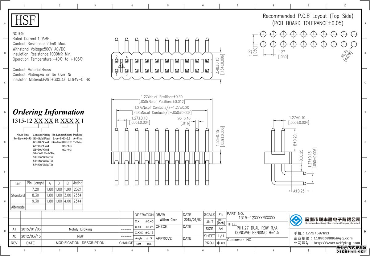 產品分類:排針連接器 產品規格:聯豐盈 1.27MM 雙排 90 DIP 排針 產品介紹:額定電流:1.0amp電流電阻:20m最大絕緣電阻:1000m民承受電壓:AC 500V /分鐘工作溫度:40﹣℃+ 105℃接觸材料: