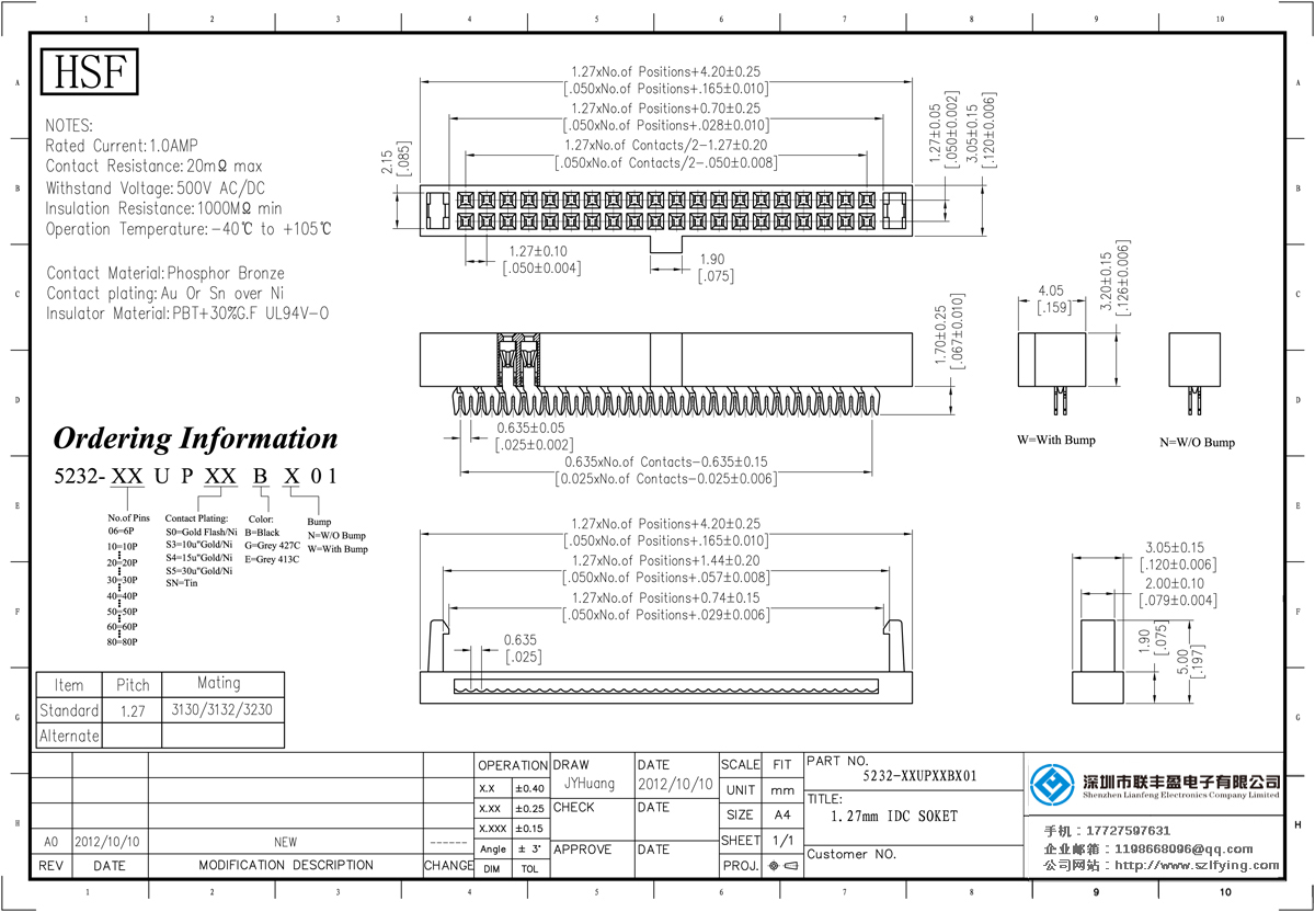 產品分類:IDC插座連接器 產品型號: 1.27*1.27MM U型 磷銅 IDC 聯豐盈 技術參數:額定電流:1.0amp電流電阻:20m最大絕緣電阻:1000mmin耐壓:1000V AC /分鐘工作溫度:40﹣℃+ 105℃接觸材料: