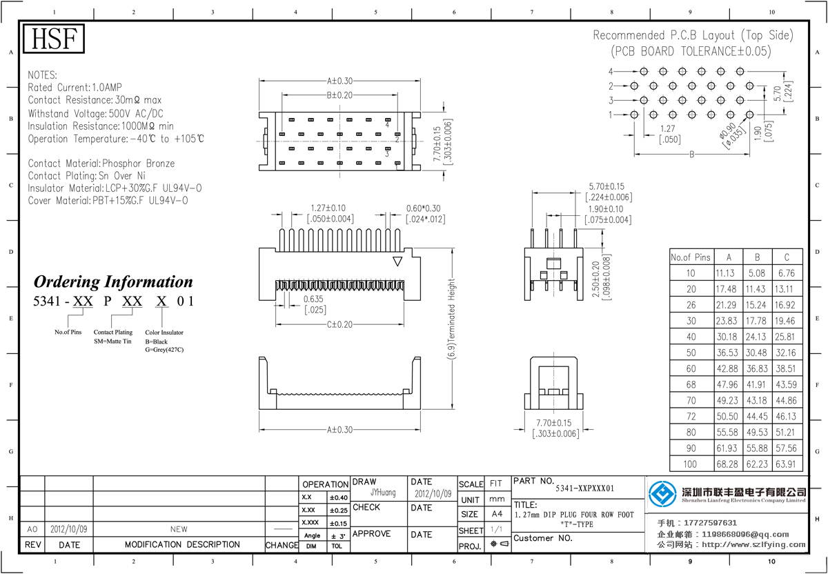 產品分類:DIP插頭連接器 產品型號:1.27 二件式四排腳 26P DIP 聯豐盈 廠家 技術參數:額定電流:1.0amp電流電阻:30m最大耐壓:1000V的交流/直流絕緣電阻:1000分鐘操作溫度:55﹣℃+ 10