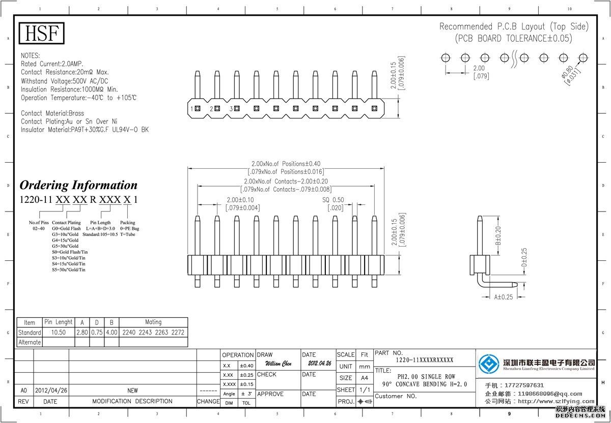 產(chǎn)品分類:排針連接器 產(chǎn)品規(guī)格:聯(lián)豐盈 2.0MM 單排 90DIP 排針 廠家 產(chǎn)品介紹:額定電流:2.0amp電流電阻:20m最大絕緣電阻:1000m民承受電壓:AC 500V /分鐘工作溫度:40﹣℃+ 105℃接觸材