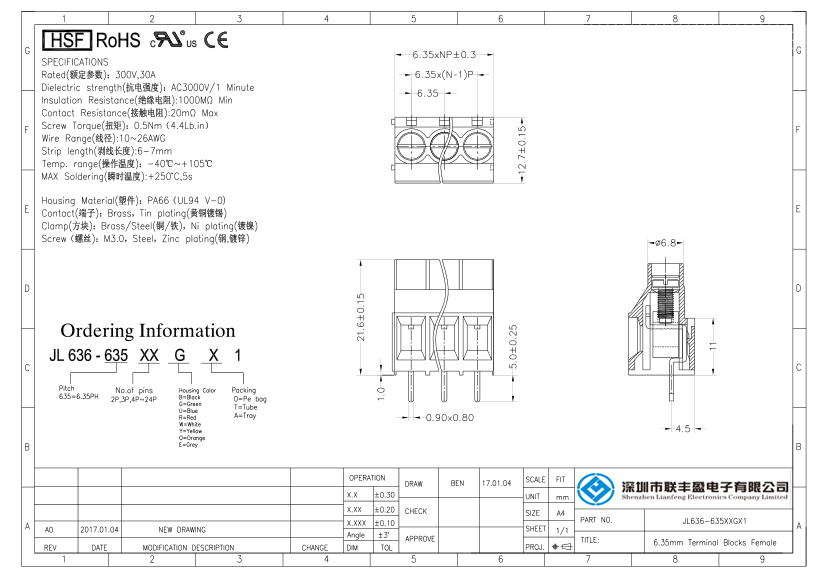 產品分類:接線端子 產品型號:螺釘式PCB接線端子 間距6.35mm 詳細型號:螺釘式PCB接線端子-JL636,間距6.35mm,CE認證,UL證書 產品介紹:材質電鍍(MATERIAL) , 螺絲(Screw)M2.0,鋼,鍍鋅