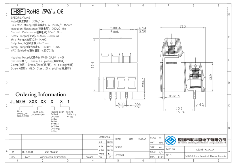 產(chǎn)品分類:接線端子 產(chǎn)品型號:PCB接線端子 間距5.00/5.08mm 詳細(xì)型號:螺釘式PCB接線端子-JL500B,間距5.00/5.08mm,CE認(rèn)證,UL證書 產(chǎn)品介紹:材質(zhì)電鍍(MATERIAL) , 螺絲(Screw)M2.0,鋼,鍍鋅