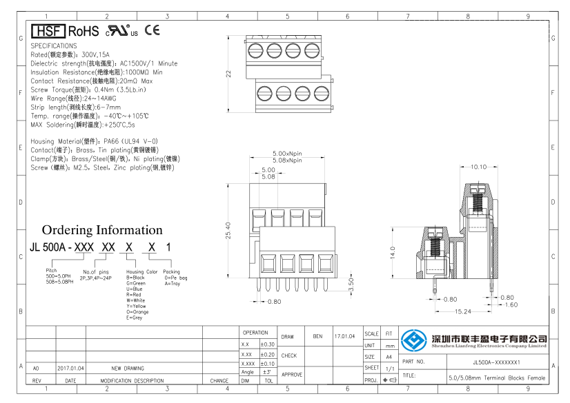 產(chǎn)品分類(lèi):接線端子 產(chǎn)品型號(hào):螺釘式PCB接線端子 間距5.00/5.08mm 詳細(xì)型號(hào):螺釘式PCB接線端子-JL500A,間距5.00/5.08mm,CE認(rèn)證,UL證書(shū) 產(chǎn)品介紹:材質(zhì)電鍍(MATERIAL) , 螺絲(Screw)M2.0,鋼