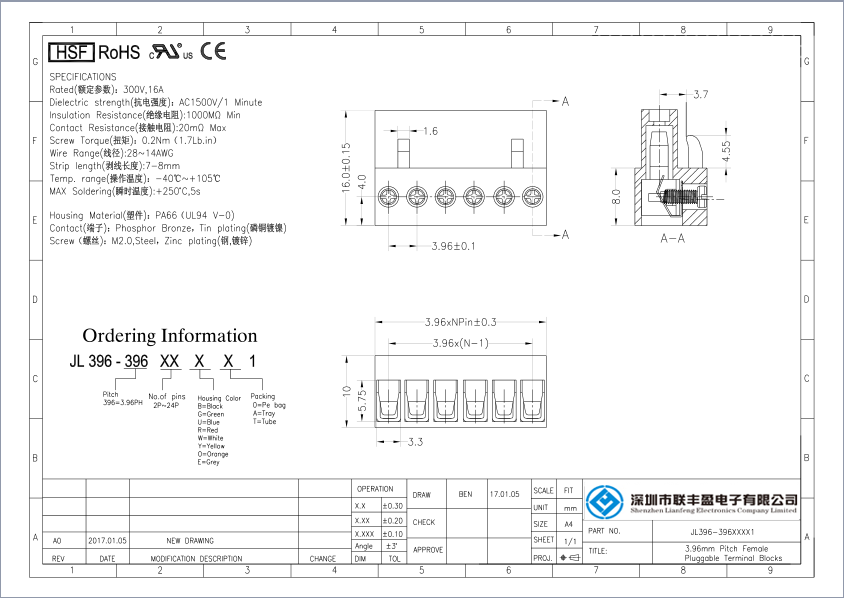 產品分類:接線端子 產品型號:插拔式接線端子-JL396,間距3.96mm 詳細型號:插拔式接線端子-JL396,間距3.96mm,CE認證,UL證書 產品介紹:材質電鍍(MATERIAL) , 螺絲(Screw)M2.0,鋼,鍍鋅