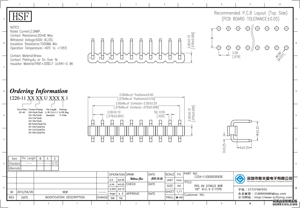 產品分類:排針連接器 產品規格: 聯豐盈 UL認證 2.0MM 單層單排 U型DIP 排針 產品介紹:額定電流:2.0amp電流電阻:20m最大絕緣電阻:1000m民承受電壓:AC 500V /分鐘工作溫度:40﹣℃+ 10