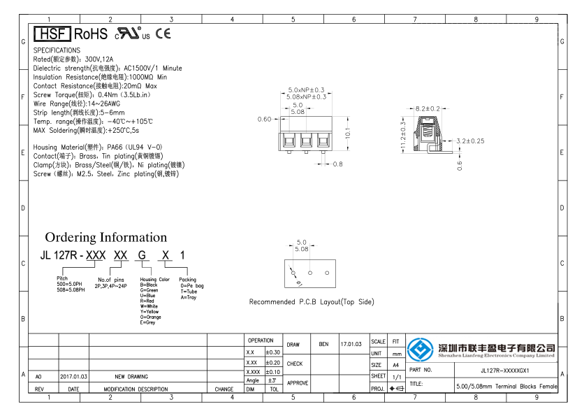 產(chǎn)品分類:接線端子 產(chǎn)品型號:螺釘式PCB接線端子-127R,間距5.00/5.08mm, 產(chǎn)品介紹:材質(zhì)電鍍(MATERIAL) , 螺絲(Screw)M2.0,鋼,鍍鋅Steel,Zinc Plated 彈片(Reed)黃銅,鍍鎳Brass,Ni plat