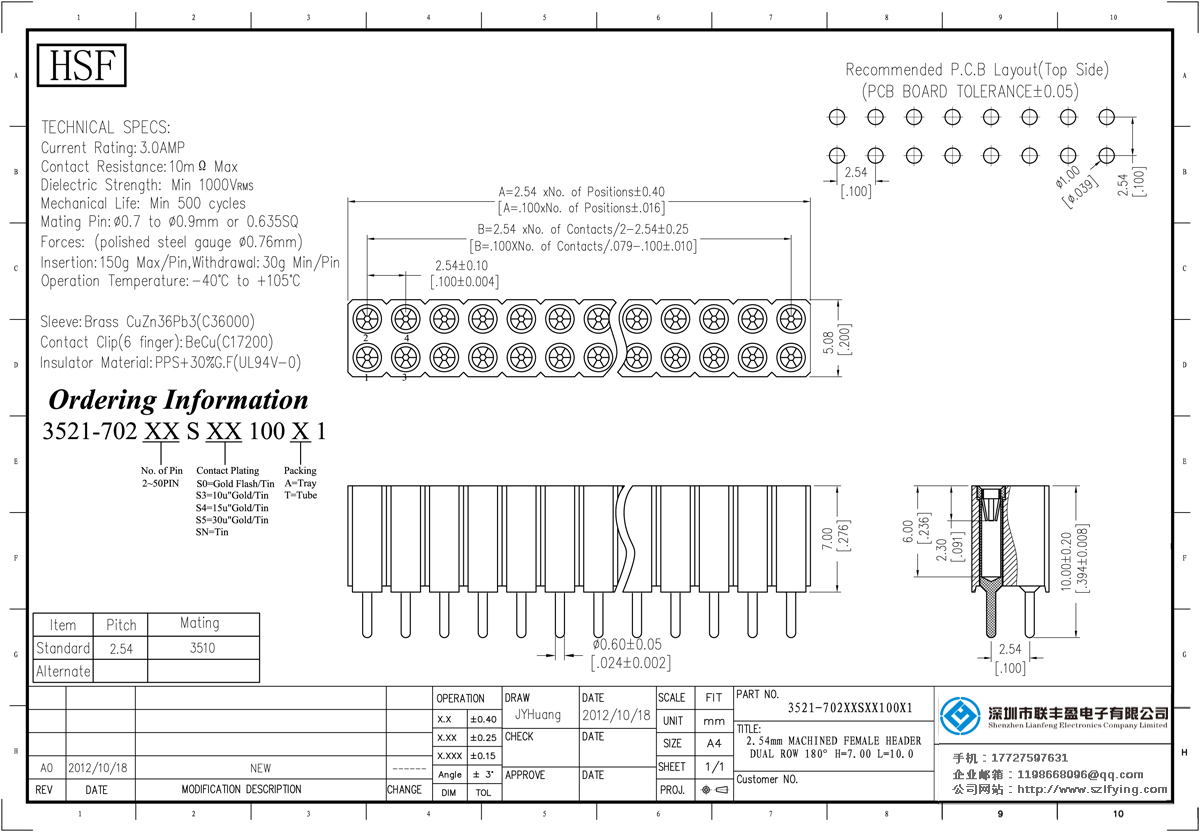 產品分類:圓孔排針排母連接器 產品型號:耐高溫 2.54MM 雙排 端子長:10.0MM 圓孔排母 聯豐盈 技術參數:額定電流:3.oamp接觸電阻:1om最大介電強度:MIN/1000vrms機械壽命:最少500次交配