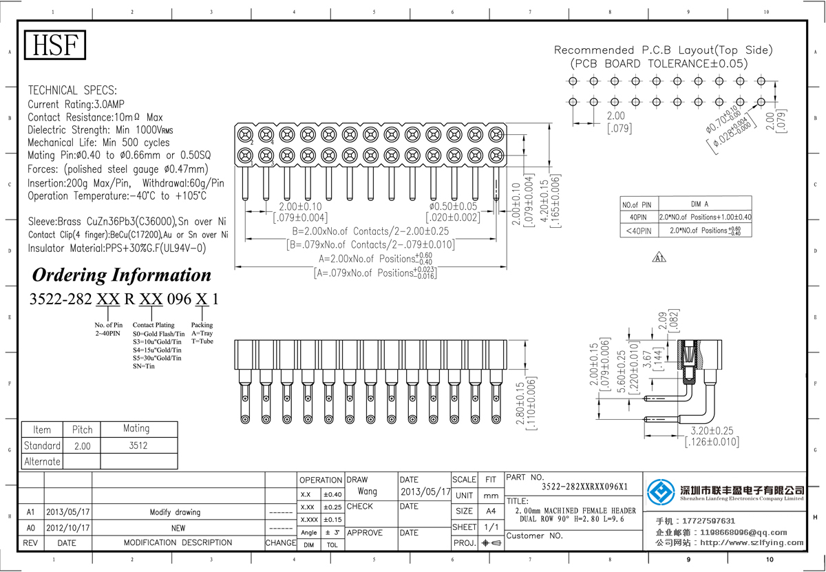 產品分類:圓孔排針排母連接器 產品型號:2.0MM 雙排 R/A 圓孔排母 廠家 聯豐盈 技術參數:額定電流:3.oamp接觸電阻:1om最大介電強度:MIN 1000vrms機械壽命:最少500次交配銷:0.400.66mm力