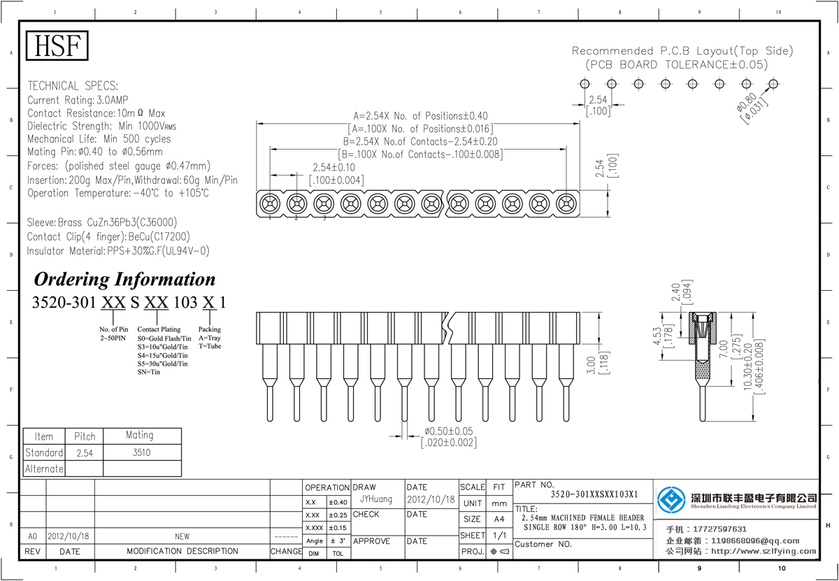產品分類:圓孔排針排母連接器 產品型號:聯豐盈 2.54MM 單排 S/T 端子長:10.3MM 圓孔排母 技術參數:額定電流:3.oamp接觸電阻:1om最大介電強度:MIN 1000vrms機械壽命:最少500次交配引腳