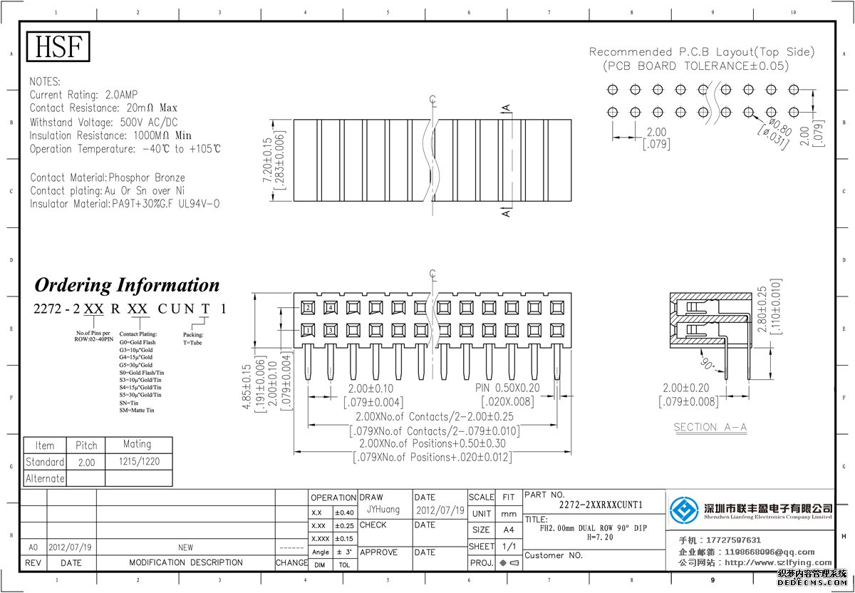 產品分類:排母連接器 產品規格:聯豐盈 2.0MM H=7.2MM 雙排 90DIP 排母 產品介紹:額定電流:3.0amp電流電阻:20m最大絕緣電阻:1000mmin耐壓:1000V AC /分鐘工作溫度:40﹣℃+ 105℃接觸材料: