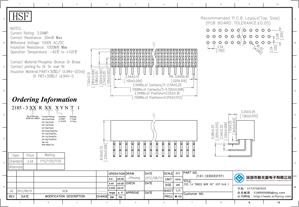 產品分類:排母連接器 產品規格:2.54MM H=8.5MM 三排 90DIP 排母 廠家 聯豐盈 產品介紹:額定電流:3.0amp電流電阻:20m最大絕緣電阻:1000mmin耐壓:1000V AC /分鐘工作溫度:40﹣℃+ 105℃接觸