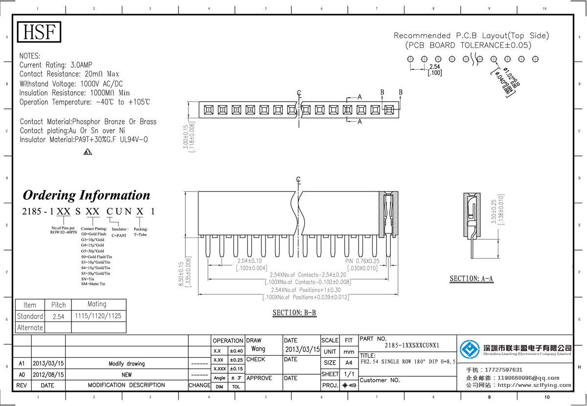 產(chǎn)品分類:排母連接器 產(chǎn)品規(guī)格:抗氧化 2.54MM H=8.5MM 單排 180DIP 排母 聯(lián)豐盈 產(chǎn)品介紹:額定電流:3.0amp電流電阻:20m最大絕緣電阻:1000mmin耐壓:1000V AC /分鐘工作溫度:40﹣℃+ 105℃接