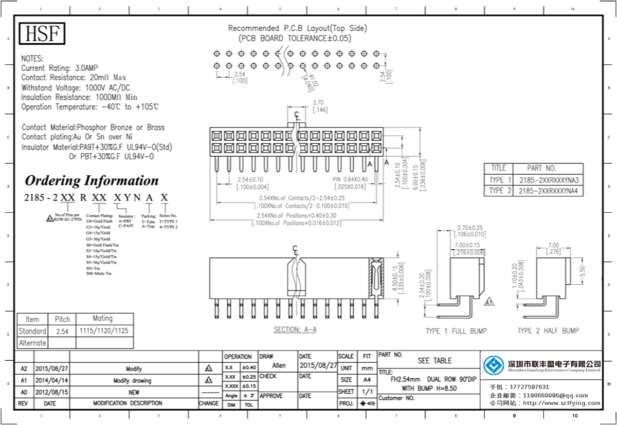產(chǎn)品分類(lèi):排母連接器 產(chǎn)品規(guī)格:2.54MM H=8.5MM 帶凸點(diǎn) 雙排 90彎插型 排母 產(chǎn)品介紹:額定電流:3.0amp電流電阻:20m最大絕緣電阻:1000mmin耐壓:1000V AC /分鐘工作溫度:40﹣℃+ 105℃接觸