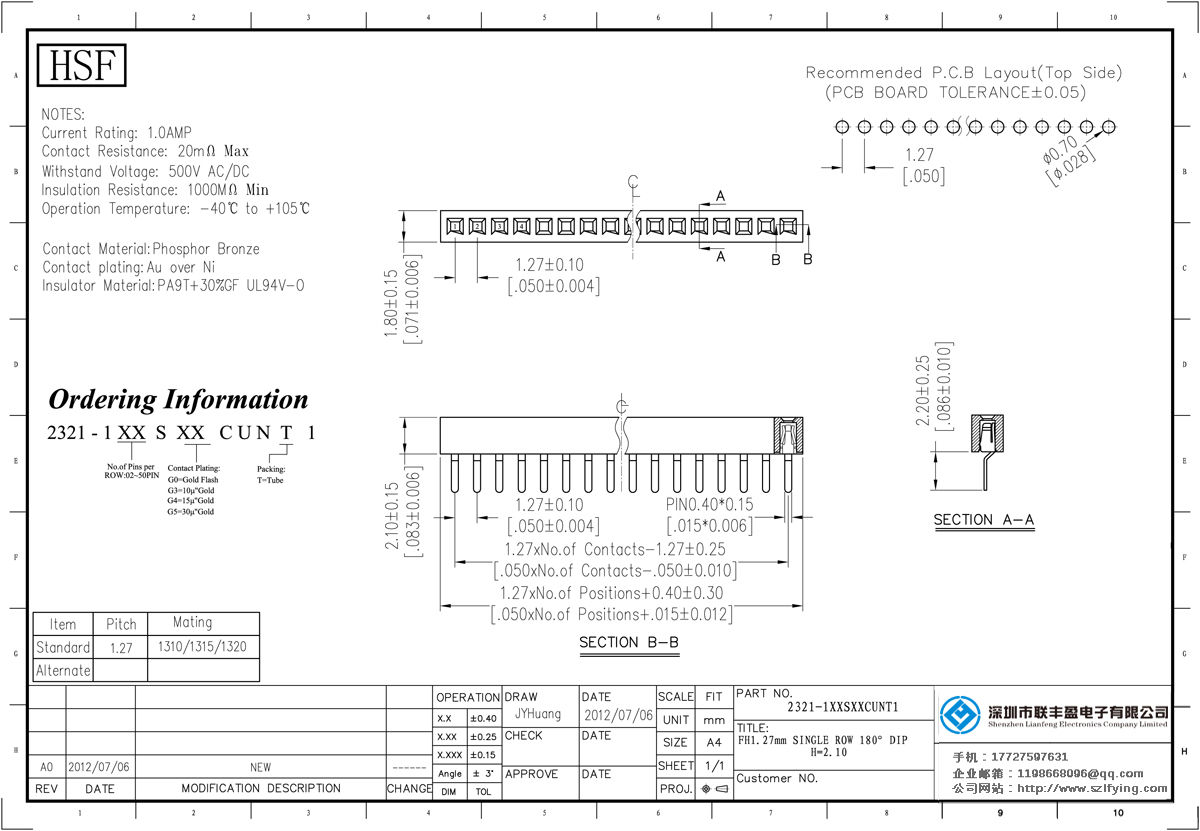 產品分類:排母連接器 產品規格:1.27MM 單排 180DIP 排母 供應 聯豐盈廠家 產品介紹:額定電流:1.0amp電流電阻:20m最大絕緣電阻:1000m民承受電壓:AC 500V /分鐘工作溫度:55﹣℃+ 105℃接
