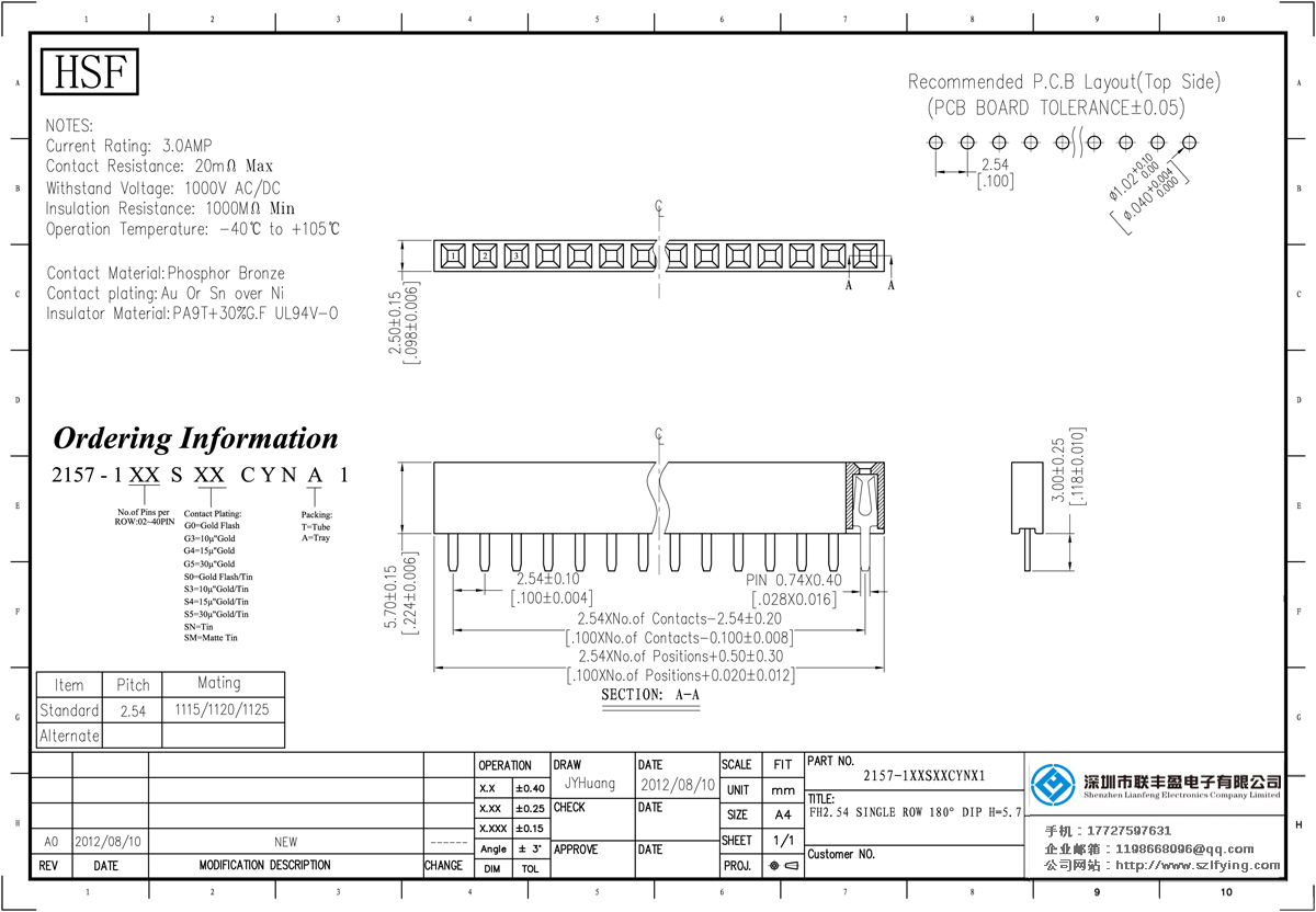 產(chǎn)品分類(lèi):排母連接器 產(chǎn)品規(guī)格:2.54mm 母頭、單排、直腳 產(chǎn)品介紹:電流評(píng)級(jí):3.0amp電流電阻:20m最大絕緣電阻值:1000m耐受電壓1000V AC /分鐘:分鐘操作溫度:﹣40℃to + 105℃:磷青銅