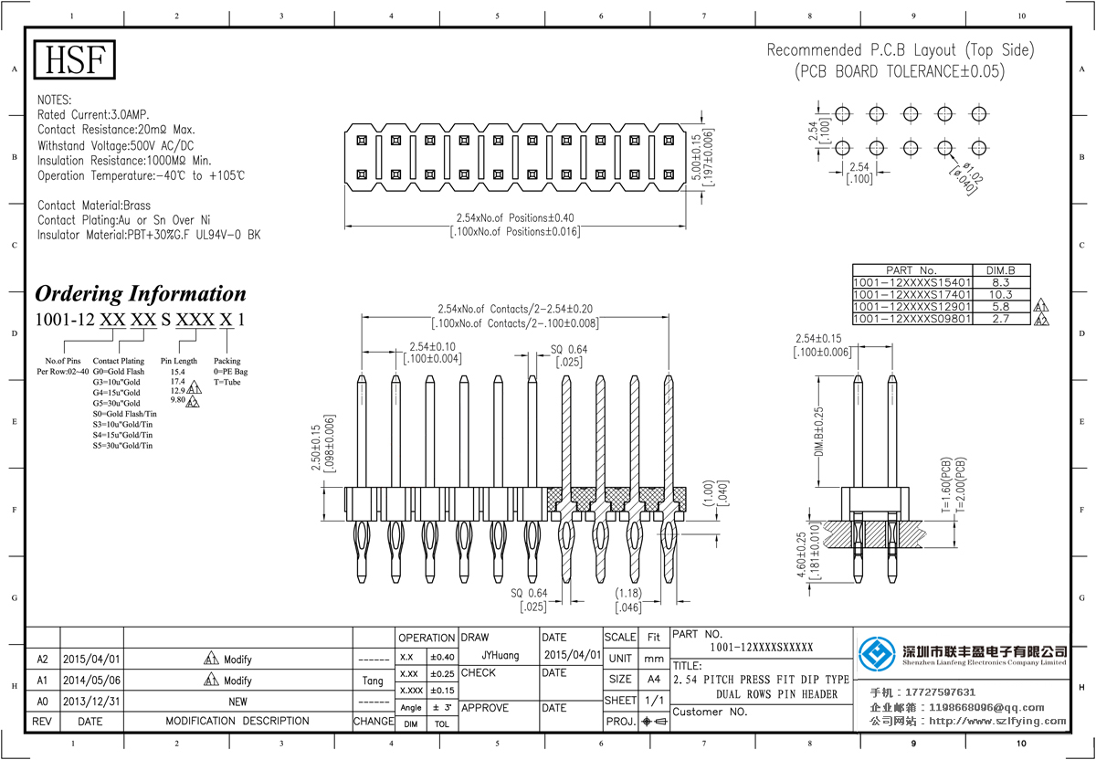 產品型號:排針 2.54間距 單層雙排 壓接式 免焊式