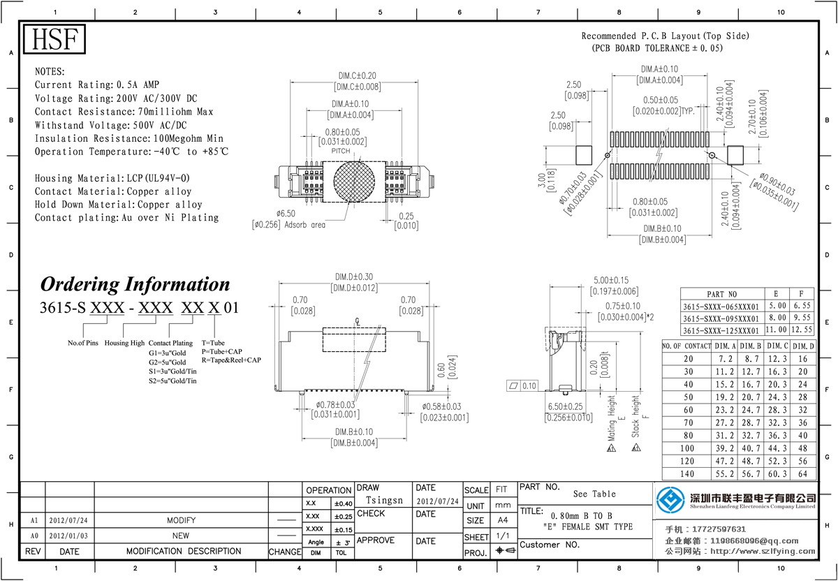 技術參數:額定電流:0.5amp電流電阻:65mΩ最大絕緣電阻:1000mΩ承受電壓:交流250V /分鐘工作溫度:40﹣℃+ 105℃接觸材料:磷青銅觸點電鍍金或錫鎳絕緣體材質:聚酯(UL94V-0)標準:LCP + 30% GF