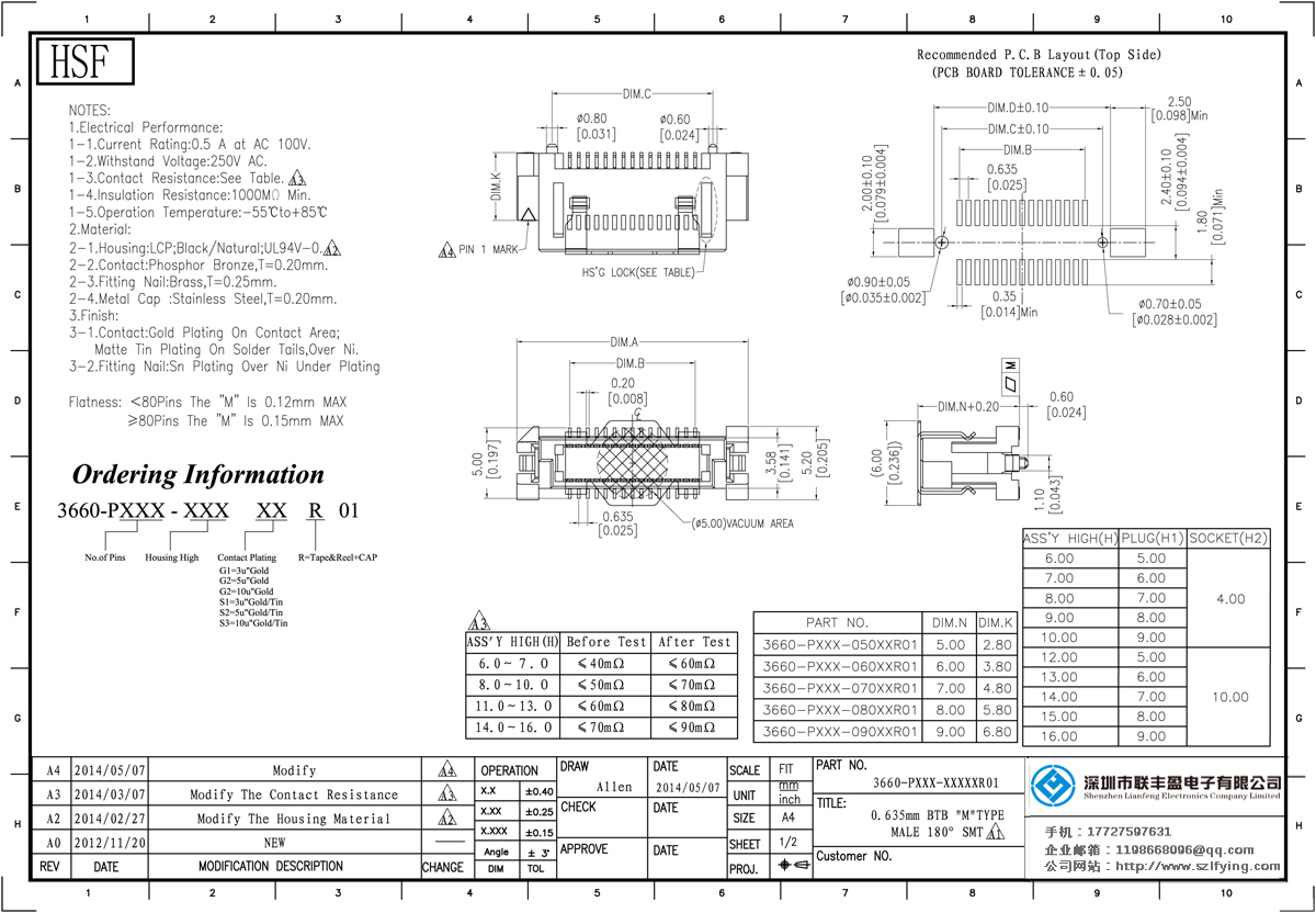 產品分類:Board To Board 連接器 產品型號:0.635間距 公座 板對板 連接器 聯豐盈 技術參數:額定電流:0.5amp電流電阻:60m最大絕緣電阻:100m承受電壓:AC 500V /分鐘工作溫度:40﹣℃+ 10