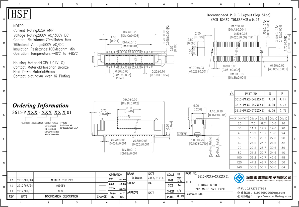 產品分類:Board To Board 連接器 產品型號:聯豐盈 辦公設備 0.8MM 母座 卷裝 Board To Board 技術參數:額定電流:0.5amp電流電阻:65m最大絕緣電阻:1000m承受電壓:交流250V /分鐘工作溫度: