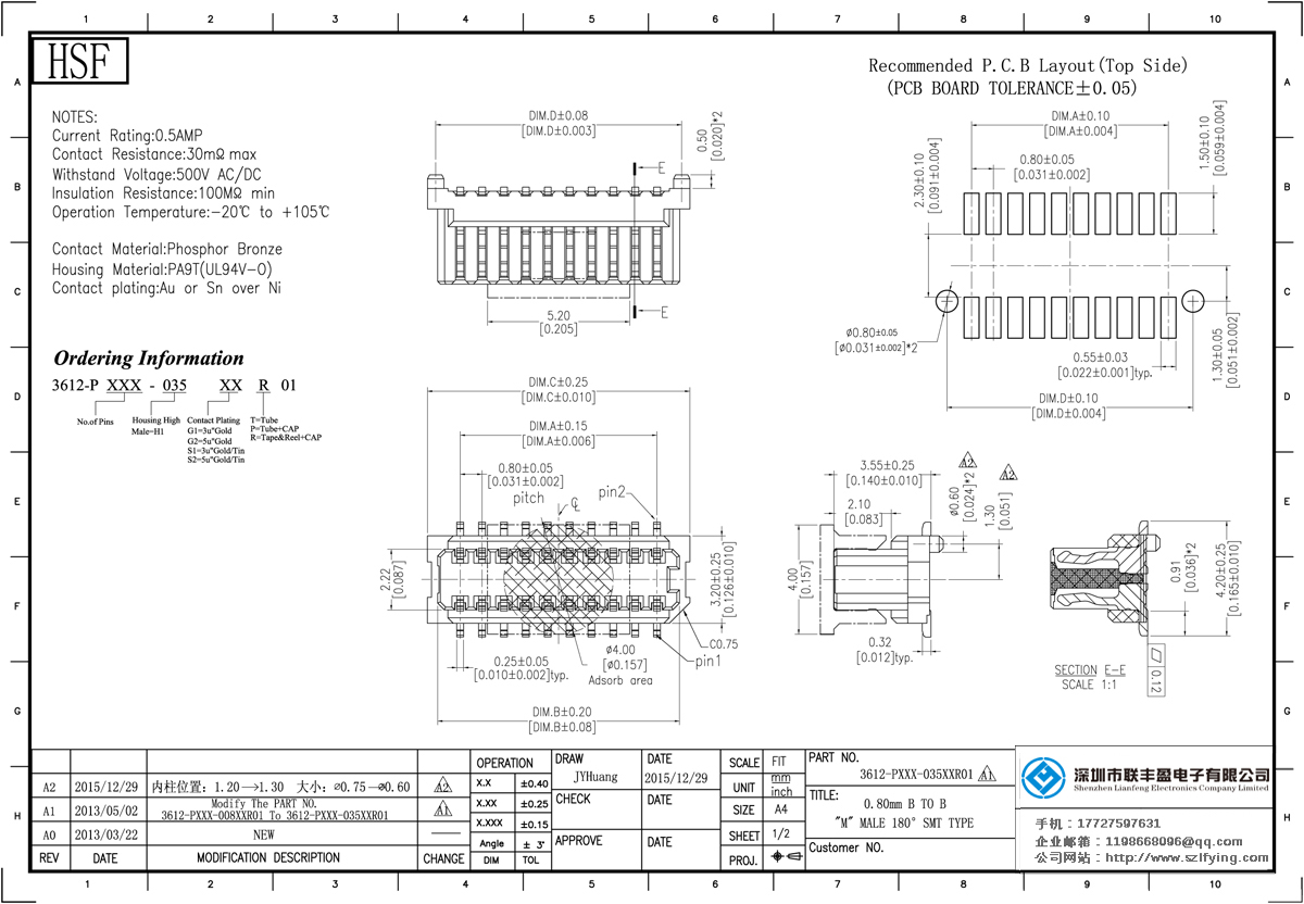 產品分類:Board To Board 連接器 產品型號:0.8MM 公座 單槽結構 Board To Board聯豐盈 技術參數:額定電流:0.5amp電流電阻:20m最大絕緣電阻:100m承受電壓:AC 500V /分鐘工作溫度:20﹣℃+ 1