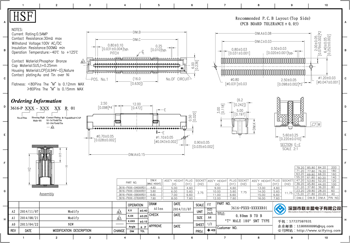 產品分類:Board To Board 連接器 產品型號:0.8MM 公座 BTB T型 Board To Board聯豐盈 技術參數:額定電流:0.5amp電流電阻:30m最大絕緣電阻:100m承受電壓:AC 500V /分鐘工作溫度:40﹣℃+ 105℃接