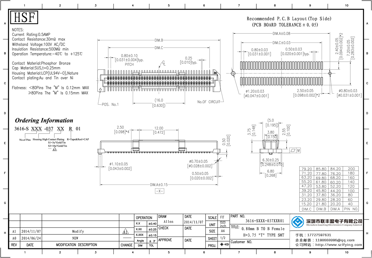 產(chǎn)品分類(lèi):Board To Board 連接器 產(chǎn)品型號(hào):0.8MM 母頭 BTB T型 Board To Board 聯(lián)豐盈 技術(shù)參數(shù):額定電流:0.5amp電流電阻:30m最大絕緣電阻:100m承受電壓:AC 500V /分鐘工作溫度:40﹣℃+ 105℃