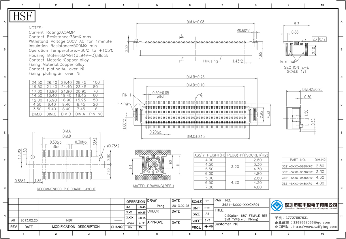 產(chǎn)品分類:Board To Board 連接器 產(chǎn)品型號(hào):0.5間距 公座 單槽 板對(duì)板 連接器直銷 聯(lián)豐盈 技術(shù)參數(shù):額定電流:0.5amp電流電阻:30m最大絕緣電阻:100mmin耐壓50V的交流/分鐘:操作溫度: