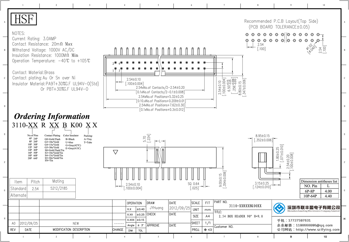 產品分類:簡易牛角連接器 產品型號: 聯豐盈 耐高溫 2.54MM H=8.9 90DIP 簡牛 技術參數:額定電流:3.0amp電流電阻:20m最大承受電壓:500V的交流/直流絕緣電阻:1000分鐘操作溫度:40﹣℃