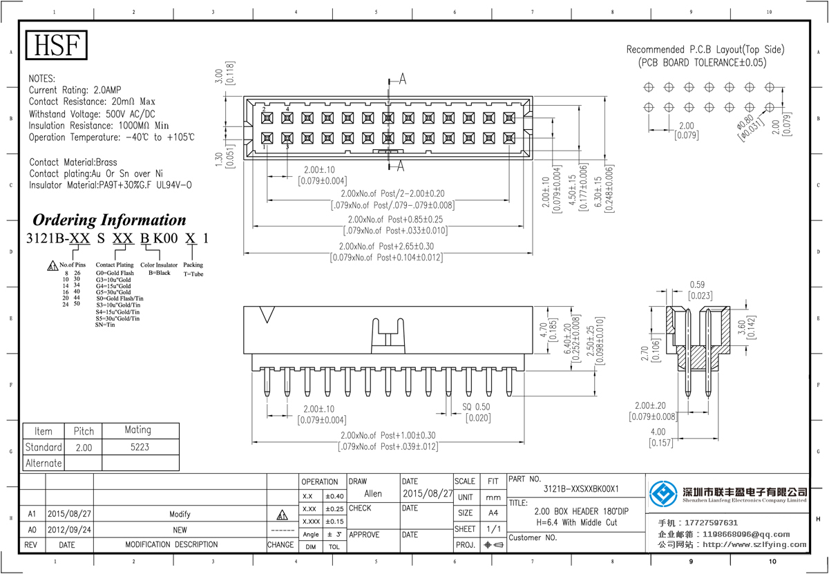 產品分類:簡易牛角連接器 產品型號:聯豐盈 2.0MM TYCO型 180DIP 簡牛 技術參數:額定電流:2.0amp電流電阻:20m最大承受電壓:500V的交流/直流絕緣電阻:1000分鐘操作溫度:40﹣℃+ 105℃接
